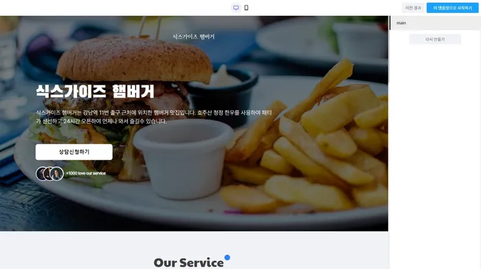 방금 만든 랜딩 페이지가 어떻게 작동하는지 확인하고 싶다면 우측 상단에 ‘재생’ 버튼을 클릭해보세요!