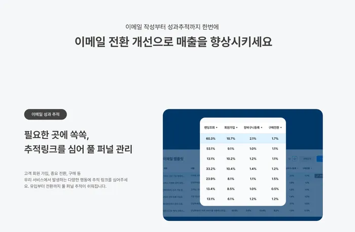 현재의 이메일 툴이 오픈율이나 클릭율 추적만 가능했다면 웨이브온은 랜딩, 회원가입, 장바구니 담기, 결제 시작부터 완료, 재구매율 추적까지 풀퍼널 추적이 쉽게 가능합니다. 특히 작성한 이메일을 본인이 사용 중인 이메일 툴에 복사, 붙여넣기하는 것만으로도 자동 추적이 가능하기 때문에 새롭게 시작할 필요 없이 쓰던 이메일 그대로 사용 가능한 것도 장점입니다.