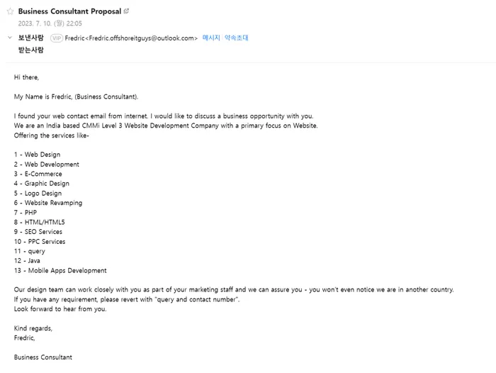 본인을 디자인 스페셜 리스트라고 어필했으나 포트폴리오나 웹사이트 등 제공하는 서비스를 도통 알아볼 수 없어서 패스한 메일 입니다.