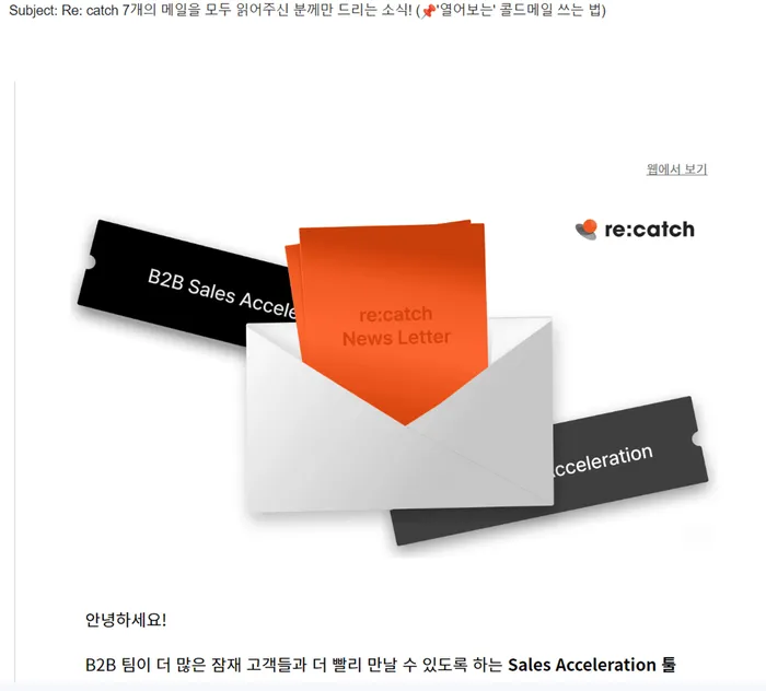 세일즈테크 SaaS 리캐치에서 최근 보내온 메일. 지난 메일링을 모두 확인한 나에게 직접 이야기 하는듯한 특별한 콘텐츠 제목으로 열어볼 수 밖에 없었고 서비스도 한번 더 들여다 보았습니다.