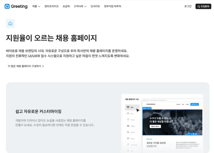 HR 특화 서비스인 그리팅에서도 현재 채용 페이지 서비스를 운영하고 있으며 빠르고 이쁘게 채용페이지를 넣을 수 있다는 장점이 있습니다. 또한 지원자가 직접 정보를 입력할 수 있게끔 영역을 설정하는 것도 가능합니다. 다만, 타 랜딩페이지 관련 서비스들에 비해 가격이 비싸다는 단점이 있습니다.